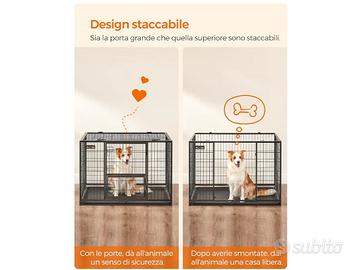 Rimuovi facilmente il cancello, quando il tuo cane non ha più bisogno del sistema di ritenuta; oppure togli la porta superiore, questa gabbia diventa un box, un nido per il cane utilizzabile anche in esterno.