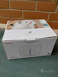 Fontanella per gatti in più che buone condizioni senza fili con batteria ricaricabile tramite cavo. Non presente caricatore, io uso quello dello smartphone. Sensore di presenza con 3 modalità di erogazione acqua. Vassoio in inox che presenta leggeri graffi del gatto. Il resto in plastica ABS. Non sono presenti filtri, ma io la usavo anche senza visto la presenza della spugna.