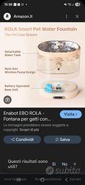 A marghera. Svendo, praticamente nuova, perché ho provato a farla usare al mio gatto ma non l'ha voluta. Ha fatto si e no UN SORSO e l'ha abbandonata. La fontanella crea un getto non molto alto ma gradevole e non rumoroso, ha la ciotola in acciaio, imateriale sicuro che evita il rischio di acne felina o l'ingestione di microplastoche, è controllabile da app e attivabile con sensore di movimento. Non da poco: i ricambi dei filtri costano poco. Affare. Nuova costa 50 euro.