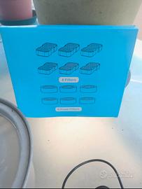 Completa di filtri per l'acqua (uno appena cambiato + 5 nuovi nella confezione) e 6 filtri nuovi ad anello di schiuma per la pompa (costo su Amazon 18€).