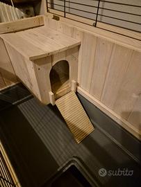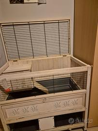 Vendo gabbia usata, ma ancora in buone condizioni. Usata per due furetti, nasce come gabbia per conigli, va benissimo anche per altri piccoli animali. Assieme alla gabbia regalo beverino da appendere. La gabbia è su due piani, molto solida e sicura, con passerella per permettere agli animali di salire e scendere e una casetta con porticina richiudibile. La gabbia all'esterno è in legno, ma i vassoi estraibili che fanno da base ai due ripiani sono in plastica e facilissimi da pulire, lavare e igienizzare. La vendo già smontata, così è più facile il trasporto. E' una gabbia che nuova costa più di 300 euro. Misure in foto. NON SPEDISCO, RITIRO SU MILANO (CIMIANO)