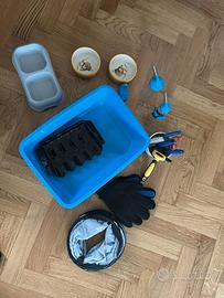 - Accessori vari: taglia unghie, ciotole, tunnel giocatolo, spazzole, cibo bunny e lettiera igenica