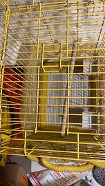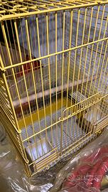 Gabbia di metallo, gialla con asse e mangiatoie, fondo scorrevole ed estraibile per la pulizia. Dimensioni 40x40x 70