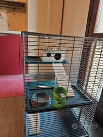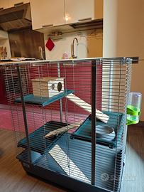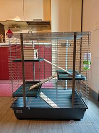 Dimensioni 47x75x85. La gabbia è NUOVA, usata solo due giorni. Viene venduta insieme ad una casetta in legno, un beverino e una ciotolina. La gabbia è comoda da pulire perché presenta due aperture frontali, la parte superiore apribile e ganci nella parte inferiore per rimuovere facilmente la base. NON SPEDISCO