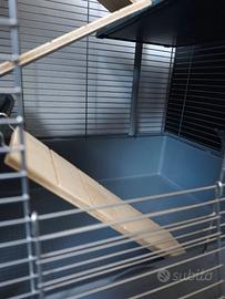Dimensioni 75x47x85 La gabbia è NUOVA, l'ho usata solo 2 giorni per la mia cincillà. Sbarre in metallo, base in plastica, scalette in legno. Due aperture frontali + parte superiore apribile + ganci nella parte inferiore per rimuovere facilmente la base. Facile da pulire e regolare. Vendo per passaggio a modello più grande.