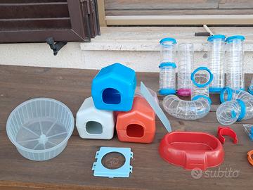 vendo gabbia per criceti e piccoli roditori con tanti accessori tra cui tunnel, casette, ruota e mangiatoie.. si possono creare svariate combinazioni come quella in foto.