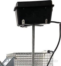 Questa struttura a piramide su 3 piani è realizzata interamente in rete e lamiera zincata. Offre 2 gabbie per fattrici, complete di nidi esterni, e 8 celle per l'ingrasso dei conigli. Completa di tutto l'occorrente. I reparti fattrici hanno il fondo in plastica anti-piaghe. Ciascun cesto fattrici misura cm P 50 x L 50 x H 37. La maglia della rete del reparto fattrici è antitopo (mm 22 x 22) ed è realizzata con filo da mm 2. Ogni cella ingrasso misura cm P 37 x L 24 x H 27. Il fondo dei reparti ingrasso è realizzato in rete zincata. Il massimo ingombro dell'intera gabbia è di cm P 106 x L 105 x H 160. L'altezza da terra del primo cesto è di cm 39. Il telaio è in tubolare zincato. La gabbia è fornita di mangiatoie, canne per l'abbeverata (compresi abbeveratoi a goccia), supporto con serbatoio da litri 8 (compreso di galleggiante, tubo e raccordi), nidi esterni con vaschetta a incasso, scivoli per deiezioni, posatoio in plastica nei reparti fattrici, portafieno tra i reparti fattrici e sui reparti ingrasso.