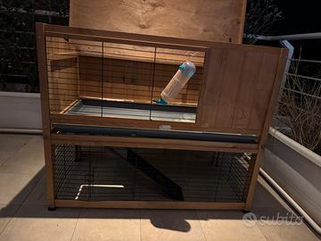 Conigliera in legno usata ma in buone condizioni. È su due livelli, lunga circa 100 cm