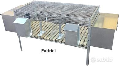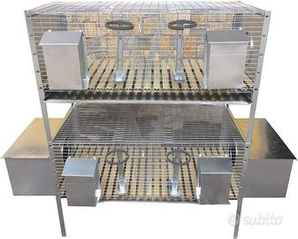 Un sistema completo per allevare conigli. Una gabbia a 2 scomparti per fattrici + una gabbia a 2 scomparti per ingrasso. Entrambe le gabbie sono complete di ogni accessorio necessario al benessere degli occupanti: 2 abbeveratoi portabottiglia, 2 mangiatoie a tramoggia ad uno scomparto munite di coperchio, 1 padella estraibile per la raccolta deiezioni, posatoio in plastica anipiaghe, portafieno. La gabbia per le fattrici è fornita con i 2 nidi. Munita di sportellino a ghigliottina per impedire l'accesso al nido e consentire l'allattamento programmato. Tutto è realizzato in lamiera e rete antitopo zincate. Il massimo ingombro della struttura è di cm 152 x 50 x H 130.
