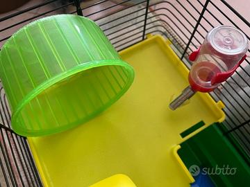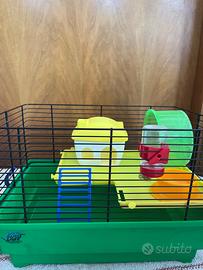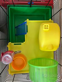 GABBIA MULTILIVELLO: struttura a 2 livelli di e realizzata in plastica resistente. Comprende una casetta sul trespolo, un serbatoio d'acqua, un piatto per il cibo, una scala e una ruota.