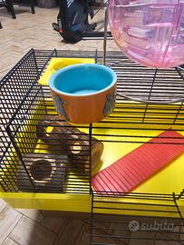 Gabbia 44x26x22 cm, fondo staccabile, con tubi esterni, scaletta, casetta igloo apribile per pulizia, legni con varie aperture, ciotola in ceramica, bagnetto con paletta, apribile per pulizia, palla running, palla running con supporto tavolo, ruota grande utilizzabile sia da appoggio che appesa, beverino a goccia, mangiatoia/dispenser da utilizzare o per periodi di assenza o per non dover riempire sempre la ciotolina cibo, legnetti di melo da rosicchiare, lettiera in carta (confermo fantastica per mantenere pulizia, no odore e da scavare), sabbietta finissima per bagnetto (pulizia pelo e gioco).