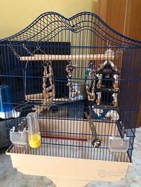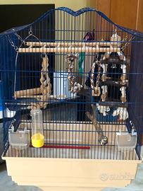 Come da titolo vendo trespolo per pappagalli con ruote (foto indicativa) di colore nero con posatoi e mangiatoie e una gabbia con ruote (misure 50/40/60 ) altezza totale 140 cm con cassettino estraibile per pulizie completo di n 2 beverini n2 mangiatoie e moltissimi accessori (oltre 60 euro solo di accessori) come scalette posatoi in legno e altalene e giochini vari come vedete in foto.