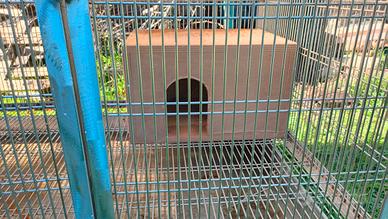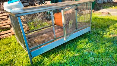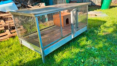 Gabbia grande rialzata per conigli o criceti, da interno o esterno; chiudibile con gancio; in regalo casetta di legno per conigli (visibile in foto) + ramp di legno per scendere e uscire dalla gabbia.