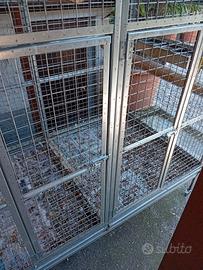grande gabbia fatta fare su misura... altezza 200cm lunghezza 180cm larghezza 100cm...con due grandi porte centrali,porticina in alto sul lato per eventuale nido, mangiatoie girevoli,griglie estraibili sul fondo, cassetti estraibili sul fondo e ruote per il spostamento