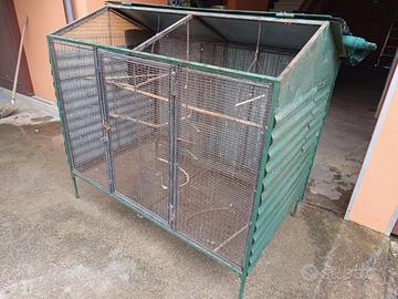 Vendo gabbione voliera grande con lamiere raccolta sporco e un divisorio a metà, con due aperture: frontale a porta e lamiera superiore tetto. Ideale per vari uccelli grandi che piccoli, o per altro uso, vedi foto. Misure lunghezza 165 cm. profonda 102 cm. altezza da terra 150 cm. Se interessati chiamare al cell. 347 5878341 o messaggio whatsapp.