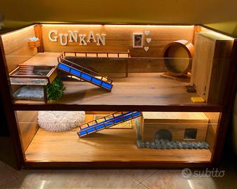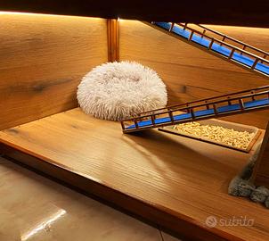 Un habitat artigianale unico, realizzato interamente a mano con legno di qualità, pannelli in plexiglass trasparente e illuminazione LED regolabile integrata.