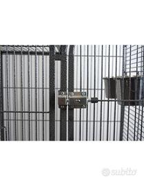 All'esterno è presente un trespolo di dimensioni 40x27cm che permetterà al vostro pappagallo una permanenza anche al di fuori della gabbia. Il trespolo è dotato di due ulteriori mangiatoie, di una scaletta e di 3 anelli dove è possibile agganciare giochi.