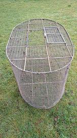 Gabbia metallica ovale (costruzione artigianale) con dimensioni cm 115×64x68 . Altezza piedini 15 cm.