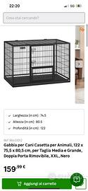 Gabbia per Cani XXL Feandrea – come nuova Vendo splendida gabbia per cani Feandrea, dimensioni 122 x 75,5 x 80,5 cm, ideale per cani di taglia media e grande. Usata pochissimo, pari al nuovo, in condizioni eccellenti. Caratteristiche principali: •Struttura robusta e sicura: telaio in metallo resistente con superficie liscia e anti-muffa, progettato per durare nel tempo. Le 5 chiusure di sicurezza impediscono qualsiasi fuga. •Dimensioni XXL: perfetta per cani tra i 42 e i 50 kg, come Pastore Tedesco, Golden Retriever o Malamute. •Doppia apertura intelligente: •Porta frontale ampia per un facile accesso •Sportellino dedicato per nutrire e interagire con il cane senza aprire tutto •Comfort per il cane: ingresso quasi senza soglia, ideale per evitare stress o fastidi alle articolazioni. •Versatile e smontabile: può essere utilizzata come gabbia oppure trasformata in un comodo box rimuovendo alcune parti. •Facile da pulire: dotata di vassoio estraibile per una pulizia rapida e pratica. Perfetta per garantire al tuo cane uno spazio sicuro, pulito e confortevole in casa. 📩 Per ulteriori informazioni o foto, non esitare a contattarmi!