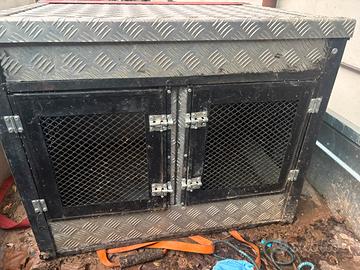 Per inutilizzo vendo gabbia per trasporto cani, in acciaio mandorlato, con divisorio centrale. Sportello apribile superiormente per stivare vanghetto, stivali, guanti, fucile.