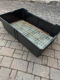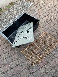 Gabbia robusta in metallo con catino a tenuta. Pieghevole e compatta. Dimensioni (cm): Hest. 62 - Hint. 58 - Hcatino 26 - L 81 - P 50