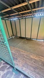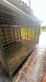 Vendo grande gabbia interamente realizzata in metallo, molto robusta e solida per accogliere grossi esemplari. Sollevata 25 cm da terra con pavimento in legno e fibra cemento, tetto in ondulina e gronda per scarico acqua piovana, pannellata su due lati e richiudibile gli altri due tramite teloni avvolgibili x riparare gli animali dal vento o acqua spiovente.