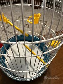 - Completa di tutti gli accessori: mangiatoie, beverino, posatoi in plastica gialla