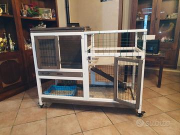 Gabbia in legno, su tre livelli per coniglietti con ruote e ripiani sfilabili per la pulizia. Misure 100 x 50 alta 100.