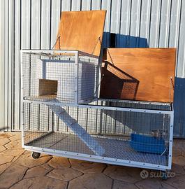 Gabbia artigianale per animali su ruote in gomma girevoli con freni, con dimensioni: 1.20m lunghezza,50 cm larghezza,95 cm altezza.