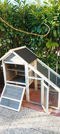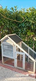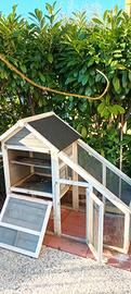 Vendo gabbia per conigli, come da foto,in legno con rete metallica, dim. 52x128x120h, tetto con guaina, porticina ingresso e finestrella scorrevole, abbeveratoio per acqua, completa n.8 mattonelle a incastro in plastica per pavimento. Acquistata nuova.