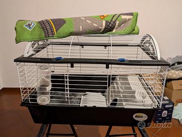 Gabbia per conigli in ottime condizioni, con caprette di supporto e tappetino
