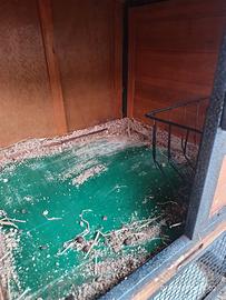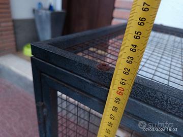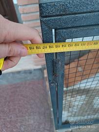 Regalo gabbia per conigli H 92cm (punta tetto), 61 cm parte bassa. Larga 117cm, profonda 51cm. In legno e ferro completa di pedana, beverino e porta fieno. Ritiro a domicilio. La base della gabbia è vuota e si può poggiare sul terreno.