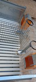 La gabbia è provvista di 2 abbeveratoi porta bottiglia e 2 manigatoie in lamiera zincata con coperchio.