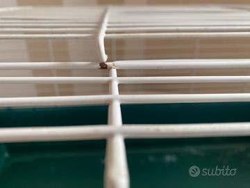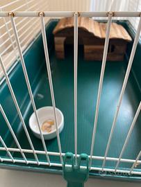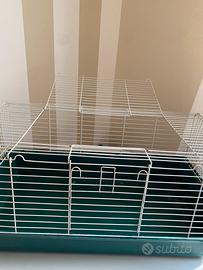Gabbia per coniglio , con casetta e ciotolina. Sulla parte in ferro sono presenti delle piccole e impercetibili puntini di rugine , sono presenti degli altri piccoli segni d’usura di cui posso inviarvi le foto.