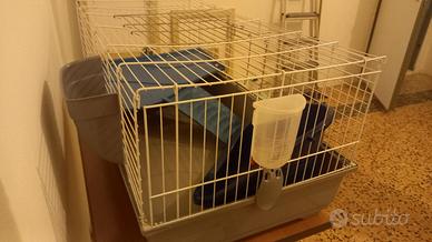 vendo gabbia per coniglio usata buone condizioni inclusa scaletta, abbeveratoio, ciotola per mangime, triangolo per lettiera e contenitore porta fieno. misure: Altezza 45 cm Larghezza 100 cm. Profondità 55 cm.