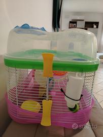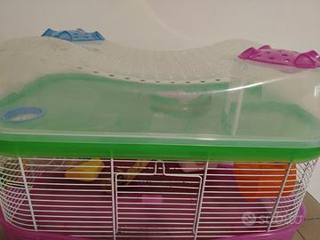 Casa su 2 piani per criceti, completa di tubo, casetta, ruota, ciotolina x mangime e giochino, inoltre lettiera di truciolato e mangime come in foto