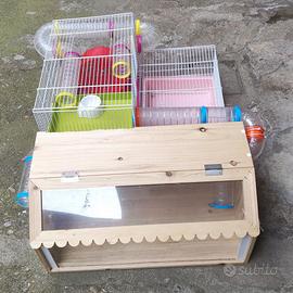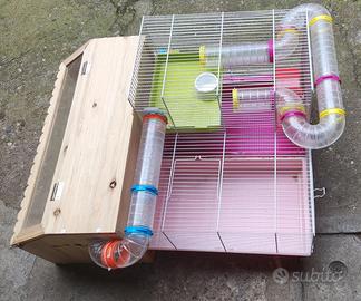 Gabbia per criceti formata da 2 gabbie a sbarre + 1 in legno comunicanti tramite tubolari da diametro 6 cm come da foto + 1 ruota da diametro 20 cm + 1 ruota da diametro 15 cm + 1 casetta in plastica + 1 abbeveratoio + 1 ripiano + 1 ciotola per cibo. Le due gabbie a sbarre, per formare questa composizione, sono state modificate tagliando la parte laterale per creare un unico ambiente. La composizione si sviluppa su un'area di circa 60x80 cm. Ritiro di persona Milano zona Forlanini.