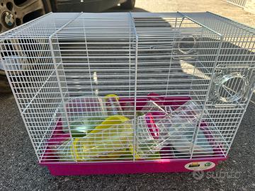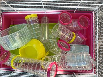 Gabbia per cricetp munita di tubi, ciotola, casetta, bottiglia e ruota.