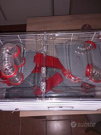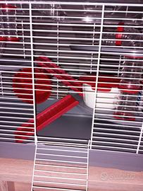 Vendo gabbia per criceti a due piani 45 x 20 x 30 circa. Completa di casetta, ripiani, rampe, tubi, ruota, abbeveratoio e ciotola per cibo. con tetto completamente apribile e fondo smontabile.