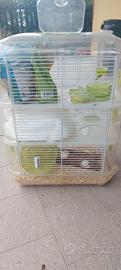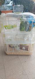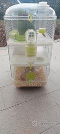 Gabbia per criceti, 3 piani, collegati con percorsi internl ed esterni, con vari accessori ( beveratoio, tubo legno scavato , ruota, ciotola, segatura) + mangime e cotone (come da foto).