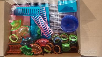 gabbia per criceti pawhut completa di tutti i pezzi: scalette, ruota, tubi, ecc... compresi i pezzi di ricambio (tutto in buone condizioni) completa anche di libretto delle istruzioni con la lista dei pezzi e in oltre regalo anche un po' di sabbia apposta per criceti