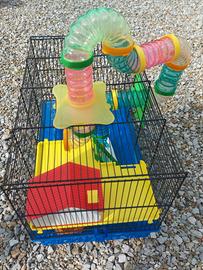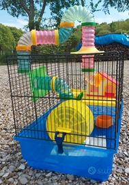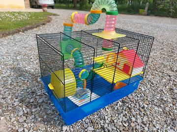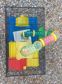 Gabbia per criceto di marca Fob, consegna in zona. Lievemente rosicchiata la casetta e mancano 2 scalini alla scaletta verde per salire al piano superiore.