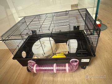 Gabbietta per criceto di buone misure, bella esteticamente e comoda da spostare perche’ ha le ruote! Con accessori simpatici e utili per il criceto! Percorso e scatolina per la sabbia!