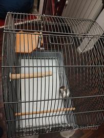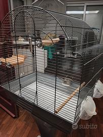 vendo gabbia per pappagalli in ottime condizioni usata poco compresa di ciotola per acqua, ciotole per semi, campanella, terrazzino e trespolo. la gabbia non è rivestita in vernice quindi ha un ottimo materiale non tossico per i pappagalli. la gabbia è circa 129 cm x 56 cm e possiede un carrello con ruote. la parte superiore in caso si può staccare. unico difetto è una delle due ciotole per mangiare è rotta e non si attacca bene.