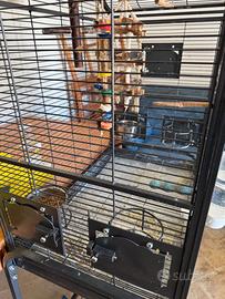 Gabbia adatta a diverse specie di volatili, io avevo 2 esemplari di inseparabili. Colore antracite. Vassoio sotto estraibile per una migliore pulizia e per tenere lontano il terriccio/giornali dal volatile. Accessori compresi come si vedono in foto (giochi, altalene, rami) tutti giochi in legno naturale. Sportelli per ciotole acqua e cibo apribili ed estraibili dall’esterno senza dover aprire la gabbia, tre tipi di aperture diverse per fare uscire il vostro volatile in autonomia. Massima protezione con il rivestimento AVILON, una verniciatura Powder Coated resistente alle forti sollecitazioni dei becchi ed unghie dei pappagalli DIMENSIONI (LxPxA): 69 x 45 x 141 cm Altezza interna: 70 cm Spaziatura tra le barre: 10 mm Spessore barre: 2 mm Peso: 25 kg La gabbia è separata dal supporto.