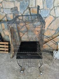 splendida gabbia per pappagalli su piedistallo con rotelle. misure: altezza totale cm 146; gabbia: altezza cm 74, per cm 51 per cm 50. apertura porta cm 31x43, apertura sopra cm31x33, porta oggetti cm38 per cm43. ha chiusura molto sicure. no spedizione visto e piaciuto.