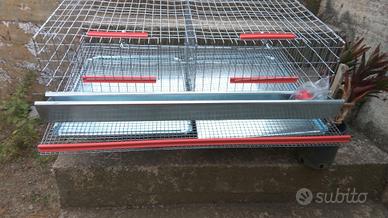 Gabbia CPO-50per 30/40 quaglie ovaiole,realizzata in robusta rete metallica zincata (copertura in rete con spessore Ø2mm e maglia 25x50mm + fili aggiuntivi per inclinazione e resistenza, fondo in rete con spessore Ø2mm e maglia 12x25mm),con altezza maggiorata, doppio raccoglitore di uova, mangiatoie più spaziose del 40%, separatore interno, 2 aperture frontali che permettono l'accesso senza dover togliere la mangiatoia e consentono di essere sovrapposte senza perdere spazio in altezza, 2 abbeveratoi automatici e speciali strisce protettive per mani e uova. Ampio scivolo raccogli uova. Misure utili 90x50xalt 27/25