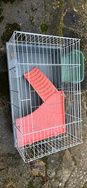 Vendo per inutilizzo gabbia spaziosa per piccoli animali, precedentemente utilizzata per un cincillà ma adatta anche a porcellini d'india, furetti o conigli nani. La gabbia è in buone condizioni generali, solida e facile da pulire grazie al fondo in plastica alta che evita la fuoriuscita di lettiera. Caratteristiche e accessori inclusi: Struttura: Rete metallica bianca Ripiano interno: Piattaforma rialzata color corallo/arancio con rampa zigrinata per permettere all'animale di muoversi su più livelli. Accessori extra: Inclusi nel prezzo anche un porta fieno esterno (colore verde) e un beverino a goccia. Praticità: Apertura frontale ampia per facilitare l'accesso e la pulizia.