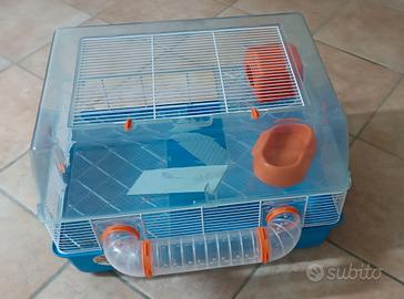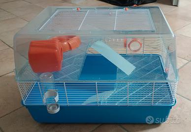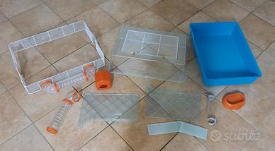 55 cm larghezza, 35 cm lunghezza, 38 cm altezza. Gabbia per roditori in plastica e ferro con apertura in alto. Suddivisa in tre piani con casetta, mangiatoia, abbeveratoio e due tubi. Composta da 13 pezzi. Comprata a 65€ la vendo a 45€