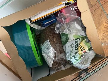 gabbia grande per roditori in buone condizioni, fornita di: trasportino, pacco grosso di tarme della farina essiccate, fieno, bastoncini per rosicchiare e altre cosine per il cricetino/gerbillo (ci sono scatole di cartone perché solimanete amano rosicchiare e usare i pezzettini per farsi la tana).